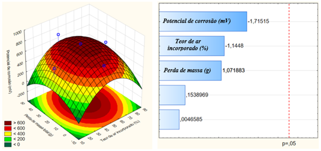 | Figura 23. (a) Superfície resposta quanto as variáveis que influenciam o potencial de corrosão; (b) diagrama de Pareto. | ||||