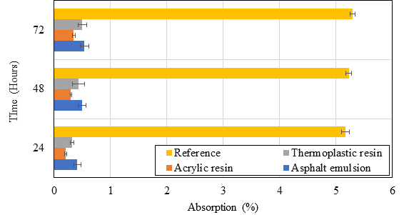 In the first periods of the test, 3 and 6 hours, the behavior of the specimens with the waterproofing products can be considered similar, since the average absorption rate in these periods was approximately 0.659%, all of which are considered statistically equivalent by the statistical test applied. However, in the last reading interval of the test, 72 hours, the specimens of the thermoplastic resin series had the lowest absorption rate of 1.05%, against an average of 2.34% of the other products. At the end of the test, the reference series had an absorption 7.9 times greater than the series of thermoplastic resin, indicating the best behavior. The asphalt emulsion and acrylic membrane remained statistically equivalent, considering the greater variability of standard deviation between them, as shown in Figure 4.
