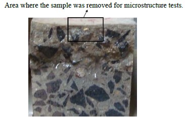 At six months of age, only two types of samples were selected for microstructure tests. These samples were taken from the traction region of the prismatic specimens without loading (SC) and subjected to Permanent Central Loading (CCP). Both were in wet cure for 7 days before undergoing shipments. Figure 9 shows a sample without loading.