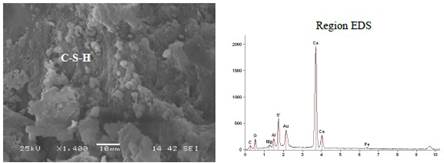 Figure 9 shows an area with dense and amorphous morphology (C-S-H Type III or IV), which is more common in this case because it is a sample at older ages. Cheng et al. (2005) observed in the concrete micrographs with different levels of blast furnace slag in high percentages, a denser structure, with few etringite needles and with capillary pores smaller than 50 nm, which may have been filled by products like CSH. The Au peak appeared in the EDS in the region of Figure 9 may be due to metallization with gold.