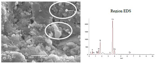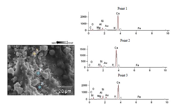 In the microanalysis, we detected the presence of the elements Ca, K, Si, Al, Mg, O and C, which are typical of cement hydration products.