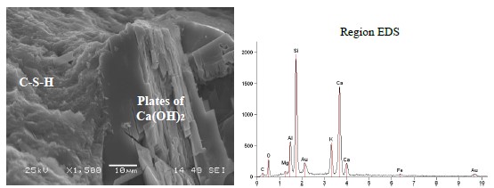 Figure 12 shows the presence of possible Ca(OH)2 and C-S-H plaques. As verified by Baroghel-Bouny (1994) Mehta and Monteiro (2008), the phase corresponding to Ca(OH)2 maintains the high alkalinity of the system, preserving the stability of the C-S-H and the concrete cover.