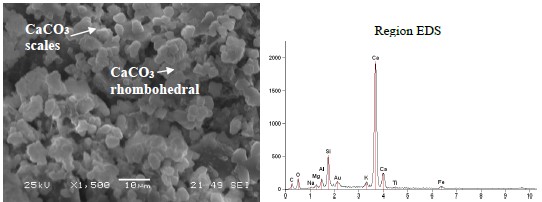 In Figure 13, it is possible to observe the formation of calcium carbonate in the form of rhombohedral crystals and in the form of scales, on a porous and possibly carbonated C-S-H. It is observed in the hydrated compounds formed, the presence of calcium carbonate (CaCO3), with different morphologies on C-S-H, which may also be in the process of being modified by the action of time, and due to its porosity. The porous C-S-H phase and the formation of CaCO3 indicated in Figure 13 was also observed by Sakar et al. (2001) in their study, with CaCO3 in the form of scales, however, in large quantities.