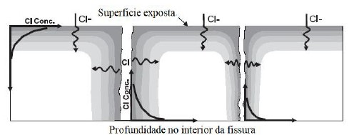 A penetração e difusão de íons cloretos podem ocorrer pela fissura conforme esquematizado na Figura 1.