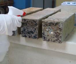 Após moldagem e desforma, o corpos-de-prova prismáticos passaram por cura úmida durante 7 dias, sendo então aplicados diferentes tipos de carregamentos e submetidos a névoa salina, em ambiente natural até as datas de ensaios (idades de 6, 12, 18 e 24 meses). Nessas idades foram avaliadas as profundidades de cloretos e realizada a Análise microestrutural (MEV e EDS).