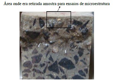 Aos seis meses de idade apenas dois tipos de amostras foram selecionados para ensaios de microestrutura. Essas amostras foram retiradas da região tracionada dos corpos-de-prova prismáticos sem carregamento (SC) e submetidos ao Carregamento Central Permanente (CCP). Ambos ficaram em cura úmida por 7 dias antes de sofrer carregamentos. Na Figura 9 é apresentada uma amostra sem carregamento.