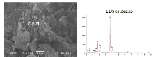 Na microanálise detectou-se a presença dos elementos Ca, K, Si, Al, Mg, O e C, que são típicos dos produtos de hidratação do cimento.