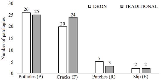 It should be noted that the most probable cause for these differences is due to the fact that some types of pathologies can be difficult to identify by the use of images obtained by UAVs due to their quality, while traditional inspection can resolve any doubts regarding the occurrence of a pathology because it is an on-site analysis. As an example, one can compare pots and cracks. In the first case, it is easier to identify by the very nature of the pathology, which in general stands out from the rest of the pavement. In the second, it is much more difficult to identify, sometimes needing confirmation through on-site inspection. In Figure 7, it is possible to compare the images obtained with the Drone and using the traditional method, for each of the types of pathologies identified.