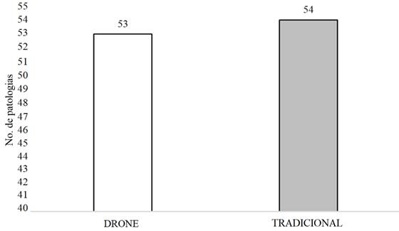 O trecho analisado apresentou uma grande quantidade de patologias em ambos os métodos empregados. A quantificação total de patologias, somando as 20 parcelas avaliadas, demonstrou valores muito próximos para os dois métodos, sendo de 54 para a inspeção tradicional e 53 para a inspeção com o Drone, o que demonstra a viabilidade do emprego do Drone para quantificação de patologias em pavimentos (Figura 5).