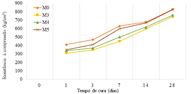 As demais amostras com 3 e 4% de substituição de cimento por pó de mármore apresentam menor resistência à compressão em relação a M5 e M0.