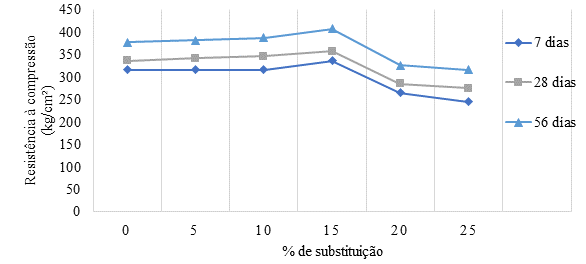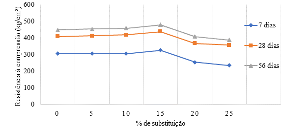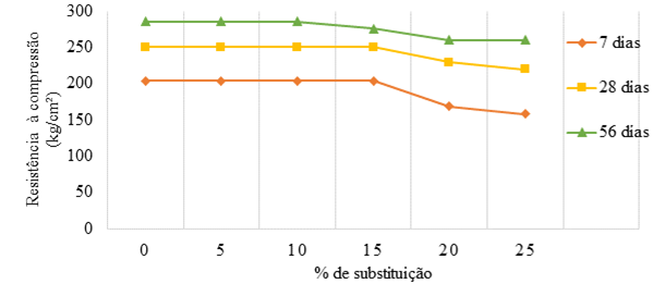 Após 28 dias de cura, a resistência à compressão das misturas afetadas a 5, 10, 15 e 20% é inferior à da mistura sem substituição de cimento.