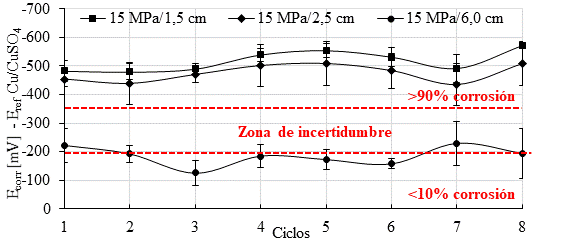 En cada ánodo se efectuó una lectura, totalizando 6 lecturas por cuerpo de prueba: cuatro en los ánodos del sensor y dos en las barras de refuerzo. En las lecturas se utilizó un electrodo de referencia de Cu/CuSO4. Para analizar los resultados con el fin de estimar la probabilidad de corrosión, se consideraron los límites encontrados en la ASTM C876-15.