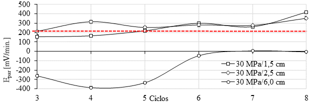 Como no se aplica corriente externa a la macro-célula galvánica, el potencial de polarización de los electrodos (ánodo y cátodo) siempre está en el rango del potencial natural de los metales dentro del hormigón (Mccarter y Vennesland, 2004). Por lo tanto, el valor de Epar fluctuará en función de las condiciones del ambiente (Pawlick et al., 1998). Siendo así, el valor de Epar debe obtenerse empíricamente (Sousa, 2014), y su valor incluye los valores de Eeq y η, prescindiendo de la determinación de estos factores por separado.