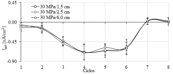 La corriente galvánica (Igal) no debe confundirse con la densidad de corriente de corrosión (Icorr), que se puede obtener mediante la ecuación de Stern-Geary, a partir del valor de la resistencia de polarización (Rp) (Martínez y Andrade, 2009), o mediante la espectroscopia de impedancia electroquímica (EIS), que continúa siendo una técnica utilizada fundamentalmente en laboratorio (McCarter y Vennesland, 2004) debido a la superposición de arcos de fenómenos simultáneos y ruidos de medición, asociados a la heterogeneidad del hormigón en estructuras en servicio (Ribeiro et al., 2015).