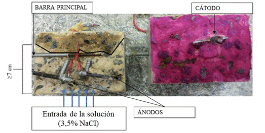 Dos de los ánodos del sensor quedaron instalados a una profundidad de 15 mm y los dos restantes a una profundidad de 25 mm, con respecto a la superficie del cuerpo de prueba expuesta a la solución de NaCl, como se muestra en la Figura 2 (b). Siendo estas las profundidades en las que el sensor debe indicar estado activo de corrosión por la entrada de cloruros. La Figura 3 muestra el proceso de producción de los prismas y la instalación del sensor.