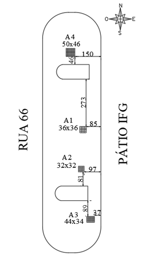 Foram fornecidos pela Diretoria de Projetos e Infraestrutura do IFG e pela Gerência de Administração e Manutenção do IFG Câmpus Goiânia: projeto de escoramento da laje datado de 2013; projeto de reforço datado de 2014; resultado do ensaio de esclerometria datado de 2013; e relatório técnico de avaliação da laje do Pórtico datado de 2019;
