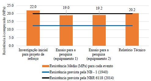 Na Figura 17 tem-se o gráfico com os valores de resistência à compressão, obtidos do ensaio de esclerometria realizados na estrutura durante o processo de anamnese e os efetuados nesta pesquisa. Os valores apresentados são uma média das resistências à compressão de áreas ensaiadas por evento de ensaio. Pode-se observar pelo gráfico que os resultados encontrados convergem para um valor médio de resistência estimada de 20 MPa, apesar dos ensaios terem sido realizados em datas distintas e por diferentes operadores.