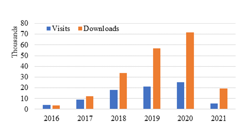 | Figure 1. Downloads and visits to the page, number of queries to summarize the articles from 2016 to 2021. (source: OJS of the Revista Alconpat) | ||||