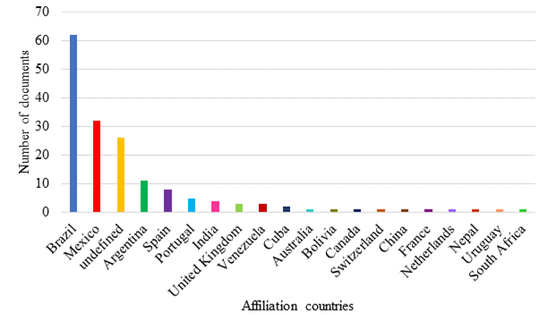 | Figure 6. Distribution of documents by country of publication (data from Scielo Analytics) | ||||