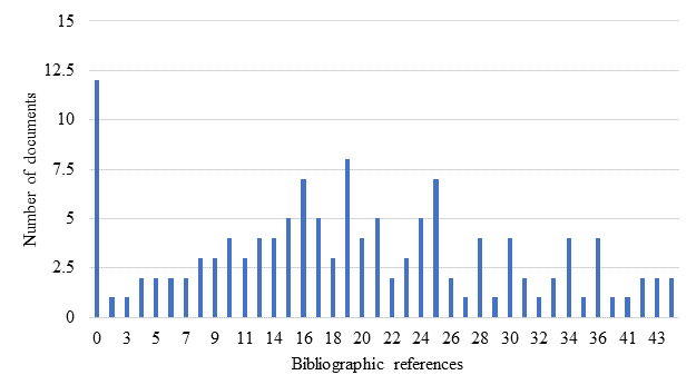 | Figure 8. Distribution of documents by number of bibliographic references per article (Scielo Analytics) | ||||