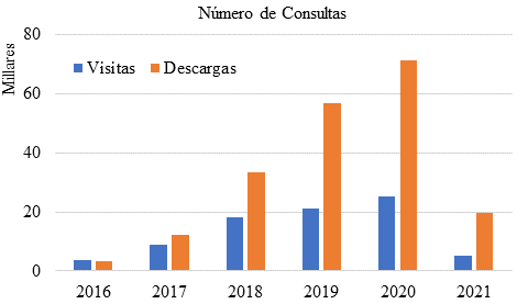| Figura 1. Descargas y visitas a la página, número de consultas de resumen de los artículos desde 2016 hasta 2021. (fuente: OJS de la Revista Alconpat) | ||||