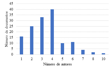 | Figura 7. Distribución de documentos por número de autores por artículo (datos cortesía de Scielo Analytics). | ||||