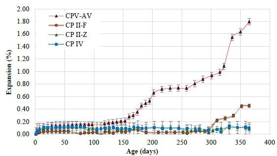 In the presence of fly-ash, and especially for the CP II-Z, a decrease was not observed at one year, considering low expansions (less than 0.10%), but in relation to 6 months, there was a reduction of just about 2% in the presence of this cement, meanwhile pozzolanic cement (CP IV) suffered a decrease of about 25% for the same period (Figure 3 and Table 2).