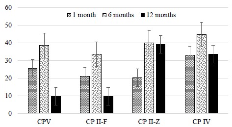 Mortars with fly-ash performed differently due to an increase of tensile strength up to the first six months, somewhat following the behavior of compressive strength, but over time and at 12 months, there was a drop of 19% and 12% for CP II-Z and CP IV, respectively (Figure 4). The initial gain in the tensile strength occurs due to the pozzolanic reactions involving the mineral admixtures that are present in these cements.
