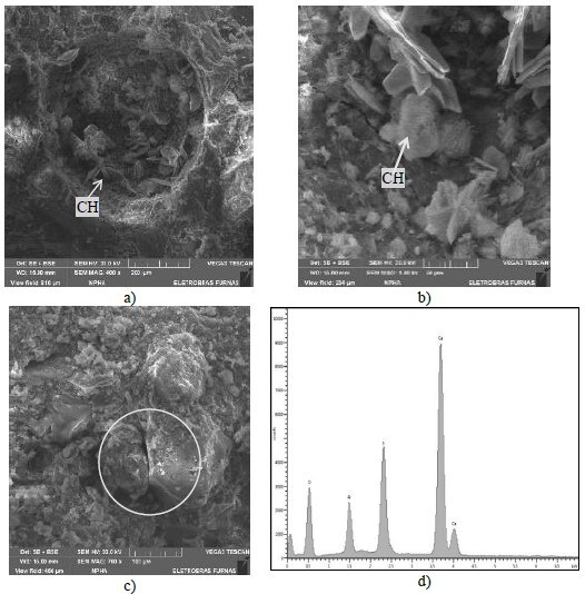 A correlation between both the strength and the level of expansions is presented in the Figure 5 and Figure 6. As expansions increase, the strengths reduce for the cement types CP V and CP II-F; on the other hand, it is not possible to stablish a correlation in the presence of those cements with fly-ash (CP II-Z and CP IV). In order to corroborate this statement, microstructural analyses were performed and clearly indicate formations of ettringite crystals in the mortars containing fly-ash. Mortar samples from the other cements were also analyzed and DEF detected. In Figures 7 - 10, DEF occurrence can be confirmed, and some EDS spectra are presented confirming the chemical feature of ettringite formations.