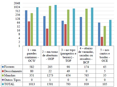 As MPs também foram quantificadas em cada região tipificada da fachada, qual seja, dada por sua localização. Para atribuição da localização das MPs a fachada foi dividida em cinco áreas, quais são: (1) em paredes contínuas-OCW, (2) ao entorno de aberturas-OOP, (3) no topo de parapeitos e beirais-TOP, (4) abaixo de varandas, sacadas ou ressaltos-BCP e (5) nos cantos e bordas-OCE, conforme Figura 2.