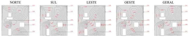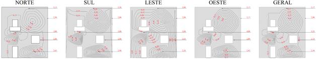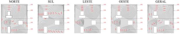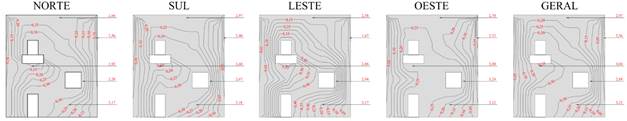 O Potencial de Degradação (DP) em cada região tipificada da edificação é apresentada nas Figuras 8 e 9, para cada orientação solar específica e geral, para os Métodos da Intensidade e Incidência.