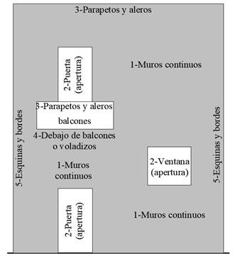 | Figura 2. . Regiones tipificadas de la fachada Fuente: Gaspar y Brito (2005) - modificado por el autor | ||||