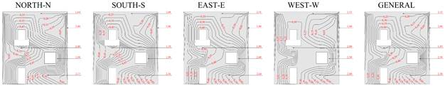 El Potencial de Degradación (DP) en cada región tipificada del edificio se presenta en las Figuras 8 y 9, para cada orientación solar específica y general, para los Métodos de Intensidad e Incidencia.