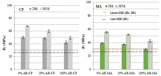 | Figure 4. Compressive strength values at 28 and 365 days for the different concretes studied. | ||||