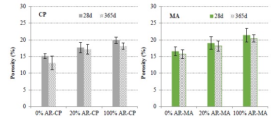 Regarding porosity (Figure 5), it increases as the substitution of AN by RA increases (Chaofeng et al., 2021, Kou et al., 2011). This increase is due in large part to the greater porosity of the recycled aggregate (Etxebarria et al., 2006). It is clearly observable in the results at 28 days that the most porous concretes are those with total replacement of natural aggregate by recycling (100% AR-CP and 100% AR-MA) and that the porosity remains practically constant in both cases, without distinction of the cementitious matrix.
