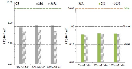 Regarding the results obtained at 28 days, in concrete with CP matrix, the substitution of 20% and 100% of the aggregate produces increments in permeability of 27% and 25% with respect to the standard; while in concrete with MA matrix the increments are 15% and 13% with respect to its pattern. At 365 days, the trend for all concretes is the same, that is, the permeability coefficient tends to increase with the amount of recycled aggregate in the mix.