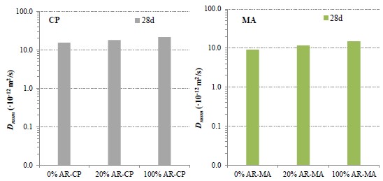 O gráfico mostra que ocorre um aumento no coeficiente de migração à medida que aumenta a quantidade de RA nas misturas, independente do tipo de matriz cimentícia utilizada, devido à maior porosidade do RA, coincidindo com o que foi encontrado por Kou e Poon (Kou e Poon, 2010) e Kou et al. (Kou et al., 2011). O coeficiente de migração é menor em todos os concretos com MA, podendo-se afirmar que a presença de CV e FCC na matriz cimentícia leva a melhorias importantes na estrutura porosa, tanto para o concreto com AR quanto com AN. Nos casos em que não há substituições de agregado reciclado (0%), o coeficiente de migração aumenta quando a matriz é composta apenas por CP, o que significa que a matriz alternativa combinada com agregado natural (0% AR-MA), se comporta de maneira uniforme melhor do que o padrão (0% AR-CP).