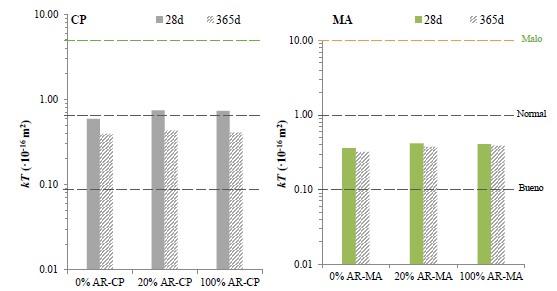 Em termos gerais, os resultados obtidos indicam que a permeabilidade ao ar tende a aumentar com o grau de substituição dos agregados em ambas as matrizes cimentícias. Além disso, pode-se observar que a matriz alternativa apresenta maior resistência ao oxigênio do que a matriz cimentícia, ambas curto e longo prazo. Esse comportamento se deve ao fato de uma parte dos CVs que não reagem atuarem como preenchedores na matriz alternativa. Porém, todos os concretos apresentam coeficientes de permeabilidade ao ar menores que 1, portanto, enquadram-se na classificação “normal”, tanto aos 28 quanto aos 365 dias.