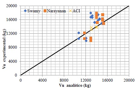 Os resultados obtidos experimentalmente mostraram que a resistência ao cisalhamento diagonal das vigas reforçadas com fibras, com estribos, é consideravelmente superior à força teórica estimada pelo código ACI-318. Adicionalmente, procedimentos teóricos de previsão da resistência ao cisalhamento foram avaliados em vigas de concreto reforçado com fibras, comparando dois modelos matemáticos obtidos na literatura (Swamy, et al., 1993 e Narayanan, et al., 1987) e os dados experimentais das 20 vigas testado para cisalhamento de tensão diagonal. Verificou-se que os dois modelos predizem adequadamente o efeito da relação a/c, o volume da fibra (Vf), a contribuição do aço longitudinal e a presença de estribos na resistência última ao cisalhamento. Os modelos de Swamy e Narayanan previram valores conservadores em relação à resistência última ao cisalhamento, aproximando-se do valor obtido pela resistência ao cisalhamento experimental.