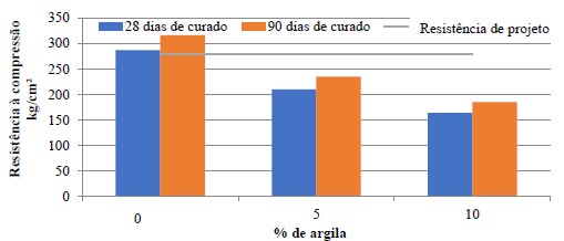 Após um período de cura de 28 e 90 dias, em condições de alta umidade relativa (corpos de prova embrulhados em jornal e saturados com água) e temperatura ambiente (≤ 25 ° C), o ensaio foi realizado de acordo com a norma ASTM C39 / C39M- 2012