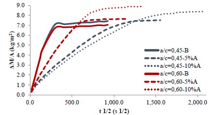 Fatias de 5 cm de espessura e 10 cm de diâmetro foram utilizadas para realizar este ensaio. Este ensaio foi baseado no procedimento descrito no manual DURAR (Troconis de Rincón, et.al., 2011), baseado na metodologia proposta por Fagerlund (1982) que descreve a cinética de absorção capilar por meio de três coeficientes: m (resistência à penetração de água), k (coeficiente de absorção capilar) e εe (porosidade efetiva).