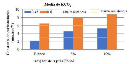 Os corpos de ensaio foram expostos ao ambiente urbano por 82 dias (28oC e 400 ppm de CO2). Uma vez selecionado o corpo de prova, foi feito um corte transversal em cada um deles e, com sua superfície livre de poeira, a fenolftaleína (indicador ácido-base) foi aplicada por atomização de forma uniforme, conforme indicado no manual do DURAR (Troconis de Rincón, et.al., 2011); medindo assim a espessura carbonatada com o uso de um paquímetro.