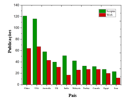 O país com maior produtividade científica é a China, com 121 artigos publicados pela Scopus, e 64 pela WoS, seguida dos Estados Unidos em segundo lugar e da Austrália em terceiro.