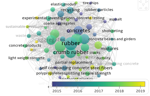 O VOSviewer é um software desenvolvido para complementar este tipo de metodologias. As informações que podem ser extraídas são a frequência da palavra-chave, que é exibida com base na área dos círculos. As menores representam palavras-chave que não são tão relevantes, enquanto as do meio (e maiores) representam palavras-chave relevantes nos diferentes artigos publicados. Por exemplo, a palavra 'borracha' é mais relevante por razões óbvias. Porém, em alguns artigos com a mesma palavra-chave, podem ser encontrados tópicos de interesse como o pré-tratamento do material ou a interface borracha-cimento. Em comparação com ‘fibras de aço’, que são as fibras de aço extraídas dos pneus usados, há pouco interesse dos pesquisadores, uma vez que há menos presença desta palavra-chave. Isso deixou claro que este diagrama fornece uma visão geral dos tópicos estudados e não reflete nenhum resultado final, é um procedimento prévio à filtragem.