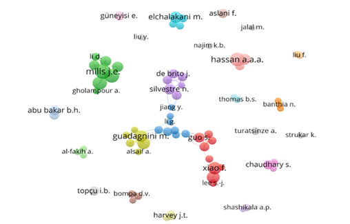 Em relação à produtividade, Mills J.E. tem 414 citações e 20 documentos até 2020, sendo o autor com maior produtividade. Por outro lado, Duarte A. P. C. e Julio E. com 8 documentos e 141 citações ocupam os dois últimos lugares dos dez primeiros. A Fig. 6 representa, graficamente, o comportamento dos dados apresentados na Tabela 4. Este diagrama visa mostrar a coautoria, que se reflete na produtividade. Isso ajuda a fornecer um ponto de partida para saber quais autores consultar para realizar uma pesquisa na área de concreto com adição de borracha.
