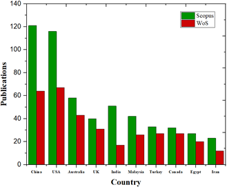 The country with the highest scientific productivity is China with 121 articles published according to Scopus, and 64 according to WoS, followed by the United States in second place and Australia in the third place.