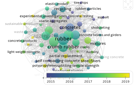 VOSviewer is a software designed to complement this type of methodologies. Information that can be extracted is the keyword frequency, which is displayed based on the circles area. The smaller ones represent keywords that are not so relevant, while those in the middle (and larger) represent relevant keywords in the different published articles. For example, the word ‘rubber’ is more relevant for obvious reasons. However, in some articles with the same keyword, topics of interest such as pretreatment of the material or the rubber-cement interface can be found. Compared with ‘steel fibers’, which are the steel fibers extracted from the used tires, there is little interest of researchers, since there is less presence of this keyword. This made it clear that this diagram provides an overview of the studied topics and does not reflect any final results, it is a procedure prior to filtering.
