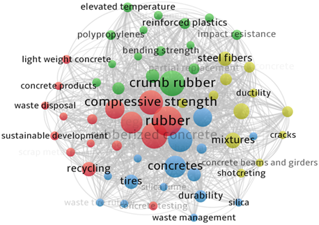 VOSviewer es un Software que está diseñado para complementar este tipo de metodologías. La información que puede generar es la frecuencia de ocurrencia de una palabra clave que se muestra en función del tamaño de los círculos en los mapas. Los más pequeños representan palabras clave que no son tan relevantes, mientras los mediano (y más grandes) representan las palabras clave relevantes en los diferentes artículos publicados. Por ejemplo, la palabra "caucho" es más relevante por razones obvias. Sin embargo, en algunos artículos con esta palabra clave podemos encontrar temas de interés como el pretratamiento del material o la interfaz caucho-cemento. En comparación con las “fibras de acero”, que son las fibras de acero extraídas de los neumáticos usados, hay poco interés de los investigadores en el tema debido a la escasa presencia de esta palabra clave. Esto deja en claro que este diagrama es útil para darnos una visión general de los temas que se han estudiado y no reflejan ningún resultado final, es un procedimiento previo al filtrado.