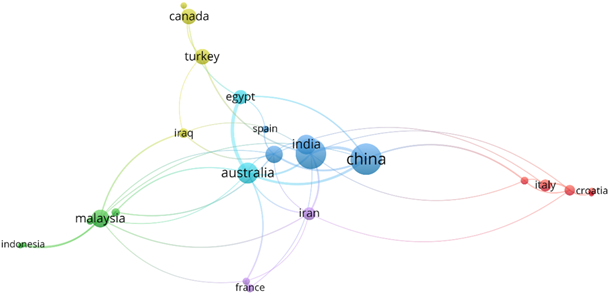 Australia y Estados Unidos tienen una relación productividad-citas similar. Siendo estos los países más importantes cuando se consideran ambas variables. Sin embargo, Irán presenta el mayor número de citas y el décimo lugar en productividad de documentos. La Figura 7 muestra una representación gráfica de la colaboración entre países y cómo están vinculados entre sí. Es un complemento al diagrama de la Figura 6, pero se centra en la colaboración entre países en un intento de especificar qué lugares del mundo tienen interés en el tema en términos de productividad científica.