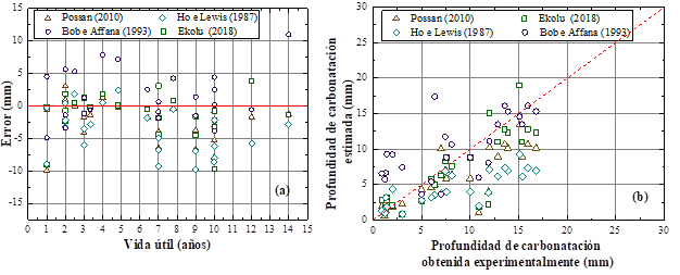 La Figura 1 (a) muestra que existe una tendencia en la que generen los modelos resultados diferentes a los observados en los experimentos. Esas observaciones son más explícitas para el modelo de Bob y Affana (1993), que sobrestimó las profundidades de carbonatación, y el modelo de Ho y Lewis (1987), que las subestimó.